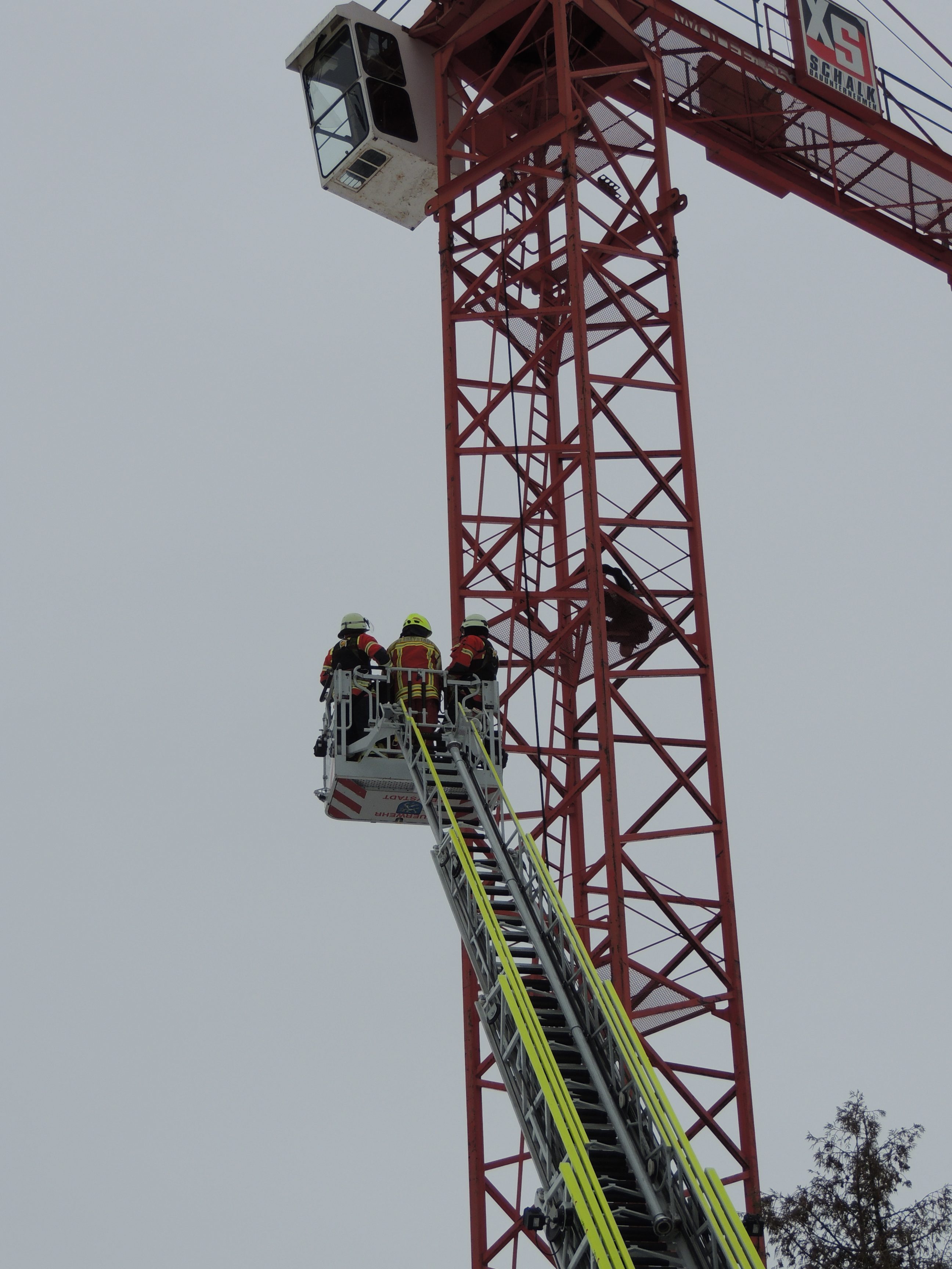 Am letzten Samstag in diesem Jahr fand kurzfristig eine Alarmübung am Neubau der Grundschul-Turnhalle mit folgender Lage statt. Angenommen war, dass eine Person im Kran-Mast gestürzt ist und bewusstlos auf einer Plattform im Mast liegt. Des Weiteren war eine Person unter einer Absetzmulde eingeklemmt.