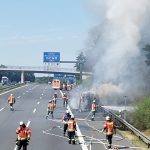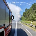 Ein Trupp unter schwerem Atemschutz begann umgehend mit der Brandbekämpfung des Fahrzeugs mittels C-Rohr. Zeitgleich gingen zwei weitere Trupps mit C-Rohren gegen den Böschungsbrand vor.