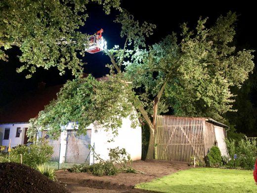 Im Allersberger Ortsteil Harrhof brach ein Baum entlang des Stamms und landete zum Teil auf dem Dach einer Garage. Nach Erkundung des Löschfahrzeugs wurde der Rüstwagen und die Drehleiter hinzugezogen. Das Garagendach wurde unter EinsatzContinue reading