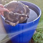 Ein Trupp, ausgerüstet mit schwerem Atemschutz und einem Kleinlöschgerät, konnte den Gasaustritt stoppen und die Flasche zur Kühlung in eine mit Wasser gefüllte Tonne legen.
