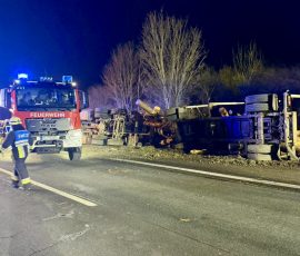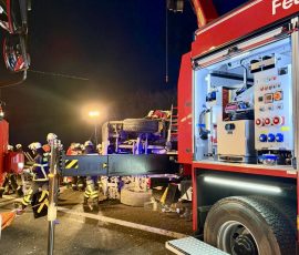 Zur Befreiung des im Führerhaus eingeklemmten Beifahrers des umgestürzten Lkw forderten die bereits eingetroffenen Einsatzkräfte den Rüstwagen-Kran aus Allersberg sowie den Feuerwehrkran der Berufsfeuerwehr Nürnberg nach.