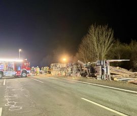 Auf der A9 in Fahrtrichtung München ereignete sich ein schwerer Verkehrsunfall mit einem beladenen Holztransporter.