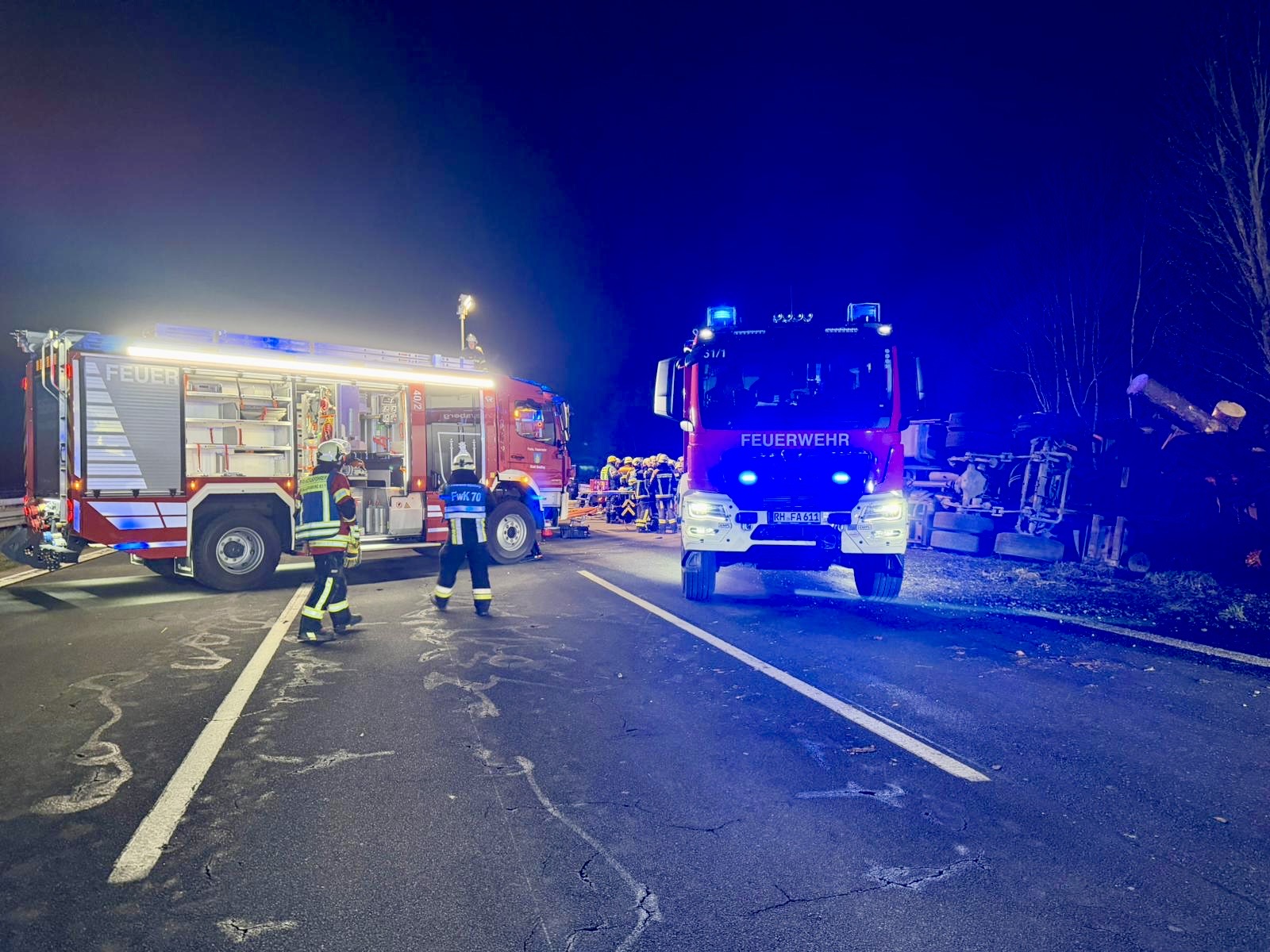 Zur Befreiung des im Führerhaus eingeklemmten Beifahrers des umgestürzten Lkw forderten die bereits eingetroffenen Einsatzkräfte den Rüstwagen-Kran aus Allersberg sowie den Feuerwehrkran der Berufsfeuerwehr Nürnberg nach.