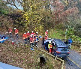 Auf der Staatsstraße zwischen Hilpoltstein und Allesberg, im Bereich einer Radwegunterführung bei Grashof, kam ein Pkw mit vier Insassen von der Fahrbahn ab, schleuderte die Böschung hinab und kam auf dem Radweg zum stehen. Zwei Personen konnten das Fahrzeug eigenständig verlassen. Der Fahrer und eine weitere Person auf der Rückbank konnten den Pkw nicht selbständig verlassen, waren aber nicht eingeklemmt. Hierfür bereitete die Feuerwehr alles für eine schonende Rettung vor. Der zwischenzeitlich eingetroffene Notarzt konnte nach Sichtung der Patienten diese zusammen mit dem Rettungsdienst aus dem Fahrzeug retten. Ein eingreifen der Feuerwehr war somit nicht mehr erforderlich.